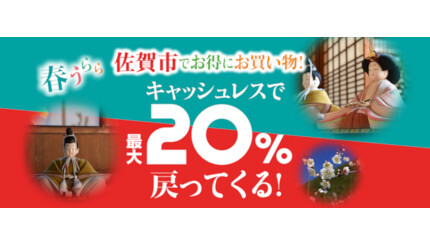 佐賀県佐賀市は2月10日~3月20日の期間、市内の対象店舗において対象のキャッシュレス決済(au PAY、d払い、PayPay、楽天ペイ)を利用すると、決済金額の20%分のポイントを還元する「春うらら佐賀市でお得にお買い物!キャッシュレスで最大20%戻ってくるキャンペーン」を実施する。