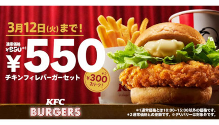 日本ケンタッキー・フライド・チキン(KFC)は2月21日~3月12日の期間、「チキンフィレバーガーセット550円」キャンペーンを全国のKFC店舗(一部を除く)にて実施する。