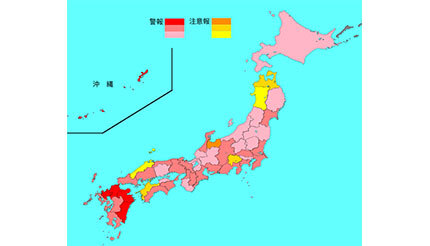 都道府県別での定点当たり報告数は、福岡県(56.48)、佐賀県(38.15)、熊本県(34.83)、大分県(34.34)、宮崎県(33.81)、奈良県(32.58)、京都府(30.44)、埼玉県(29.74)、沖縄県(29.70)、大阪府(29.56)、愛知県(29.55)、長崎県(28.01)、神奈川県(27.78)、千葉県(27.21)、兵庫県(26.67)、宮城県(25.59)の順。定点医療機関からの報告をもとに、この1週間に定点医療機関以外の医療機関を含む全国の医療機関を受診した患者数を推計すると、約75.6万人(95%信頼区間は69.8~81.5万人)となり、前週の推計値(約73.8万人)よりも増加した。