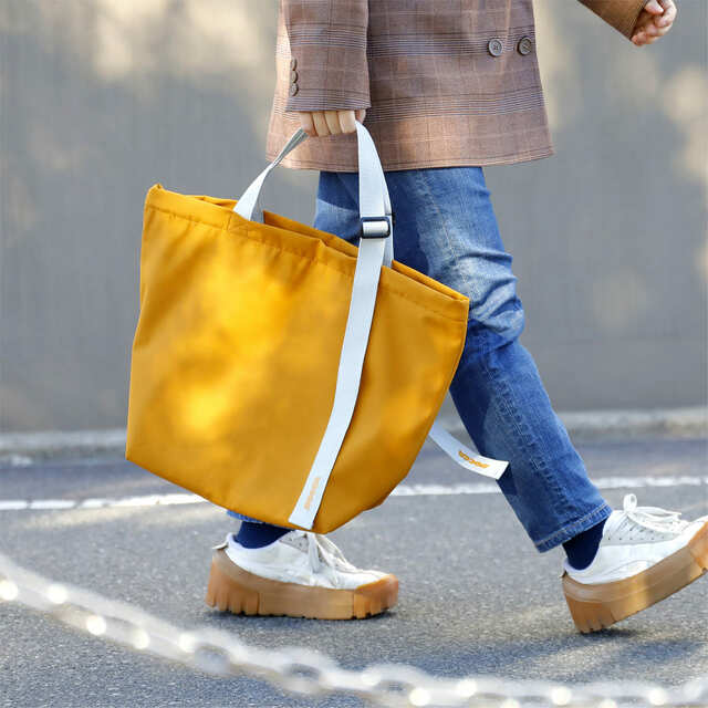 持ち手部分は長さの調整ができるため、手持ち、肩掛けの2WAYで使用が可能。カラーはブラックとマスタードの2色で、ユニセックスなデザインは男女ともに使えます。