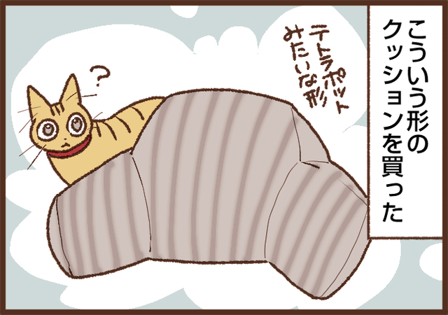 「ソファが猫に占領されている」とか「ベッドが使えない」みたいな話はこれまでにも描いてきたのですが、このクッションを買った際は「ホントに変わった形だからこれは大丈夫だろ!」と思ってたので、乗ってるのを見た時はちょっと衝撃でした(笑)