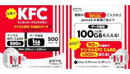 また、新規加入キャンペーンとしてキャンペーンコード「KFC24」を入力してpovo2.0に新規加入(SIMの有効化)すれば「100GB(3日間)」が必ずもらえるほか、抽選で90%の確率で「デジタルKFC CARD 1,000円」があたるキャンペーンも実施。キャンペーン期間は2月19日10時から2024年2月29日23時59分までとなる。