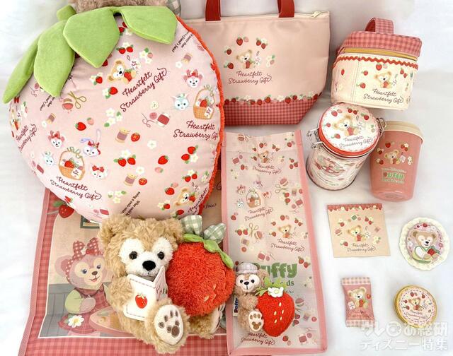 東京ディズニーシーで2024年1月15日に発売された「ダッフィー&フレンズのハートフェルト・ストロベリーギフト」のスペシャルグッズとスーベニア。