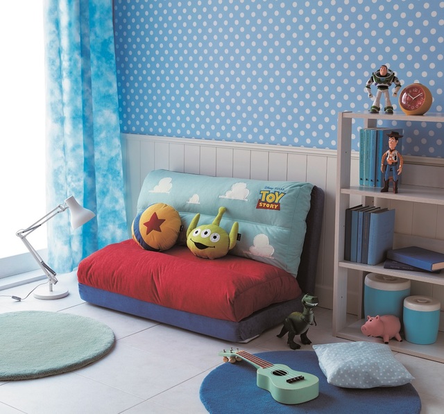 置くだけで子ども部屋らしい可愛さが演出できる「モチーフ型クッション&ブランケット付き4WAYソファーベッド(選べるキャラクター)」。