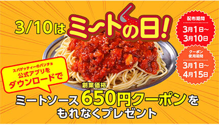 「スパゲッティーのパンチョ」や「キッチンパンチョ」を全国で展開するパンチョは3月1~10日、「ミートソースの日(3月10日)」を記念して「ミートの日キャンペーン」を開催し、期間中に公式アプリ内で「ミートソース創業価格クーポン」(650円クーポン)を配布する。クーポンの使用可能期間は3月1日~4月15日まで。