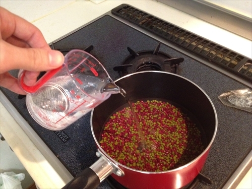 さてさて、それでは、おしるこ作りを再開させましょう。お鍋に、あずきにかぶるくらいの水を入れて、強火にかけます! 沸騰したら火を弱め、あずきがふつふつとダンスを踊るくらいの火加減で煮ていきましょう。