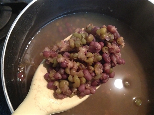 そして、1時間後…。しっかり煮えて、あずきが「あんこ」っぽくなってきました! でもよく見ると、青あずきの粒はほとんど破裂して潰れています!