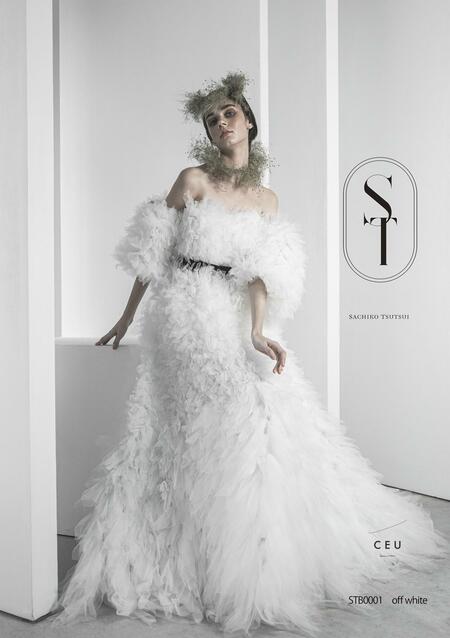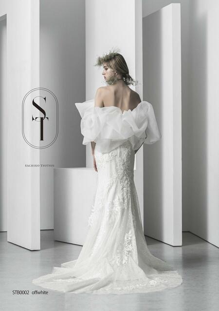 たっぷりとたくし上げられた、ワッシャーオーガンジーのダイナミックなパフショルダーを合わせることで、細身の美しいシルエットを、さらに際立たせる事ができます。