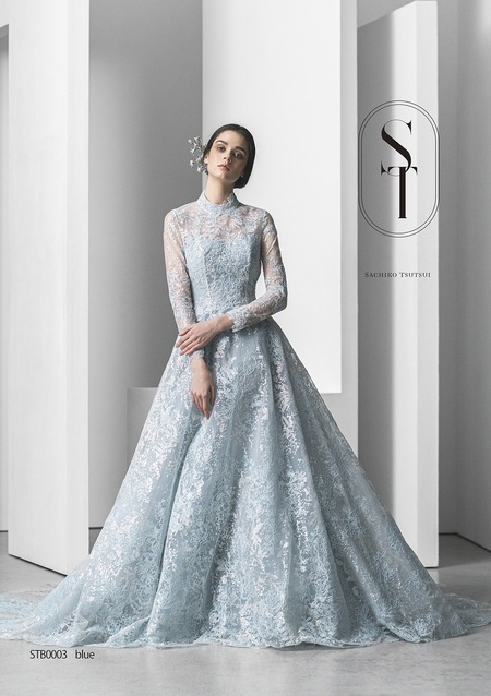 光輝くグリッターチュールの上に、コード刺繍が施されたリュクスレースを重ね、シンプルなAラインに仕立てた一着。