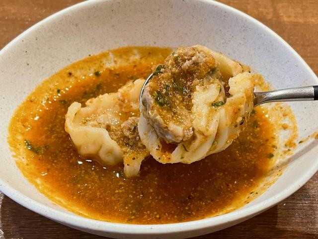 やや深い皿に盛られたモモに、サロズさんが温かいスープをかけてくれた。