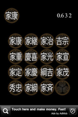 徳川15代将軍を順番にタップしていき、その速さを競うゲーム。なのだけど、4代目からだいたいわからない人、多し。でも、大丈夫。画面左上に次はコイツだというガイドが表示されるので。でもですよ、覚えないかぎりいっこうに速くタッチはできません。4代目でつまづいて、次は6代目でつまづいて、7代目もわからない...。あああ~、イライライライラ。