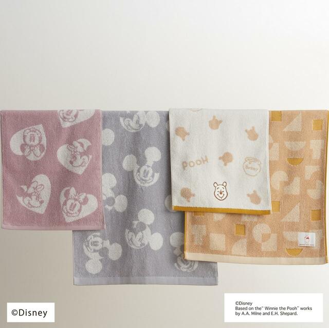 タオルは、ミッキーアイコンの中にミッキーを、ハートの中にミニーを、そしてプーさんを織り上げて表現。