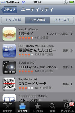 こんなB級アプリ、誰が使っているのかと思ったら、2011年クリスマス前後のAppStoreのユーティリティのカテゴリランキング1位になっていてびっくり。侮れません。