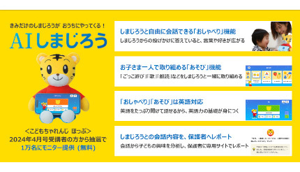 AI「しまじろう」は、ベネッセが提供する「こどもちゃれんじ」年少向け講座「ほっぷ」の受講者限定で募集する、1万人のモニターが無料での体験が可能となっている。モニターは、「こどもちゃれんじ ほっぷ」4月号受講者の中から抽選で選ばれ、7月31日まで体験できる。
