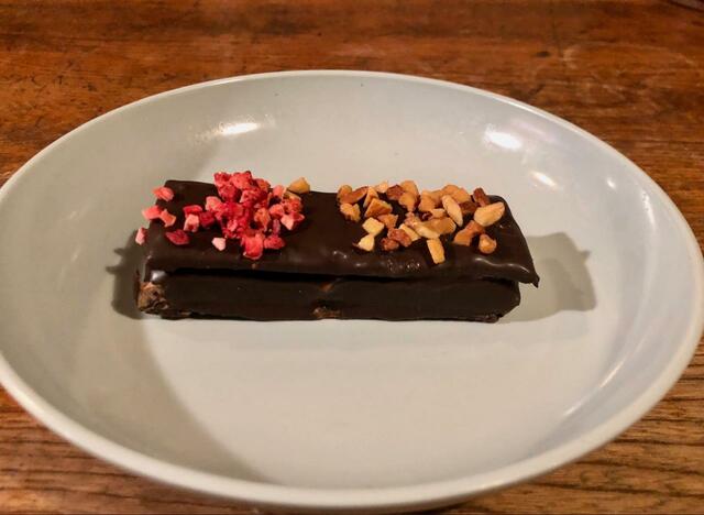 たっぷりとしたチョココーティングの上に色鮮やかなフリーズドライの苺とアーモンドがトッピングされていて見た目も華やか。