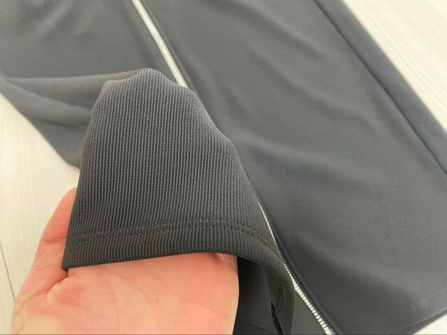 生地はポリエステルメインですが、安っぽく見えないのが特徴です。手触りはジャージのような伸縮性のある生地ですが、絶妙な厚さとツヤで高級感があります。