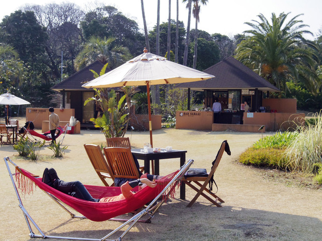 芝生の広場にパラソル&ハンモック。アジアンメニューが味わえるカフェやバーがあります。ナシゴレンにガパオ、チキンの香草焼き、どれも美味しそうです。