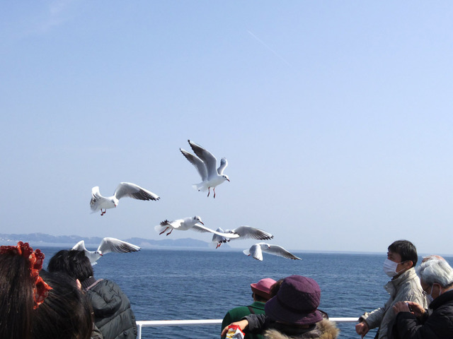 いつも乗船している観光客にエサをもらっているのであろうウミネコたちが、島までずっと船について来てくれます。子どもは喜びそうですね。