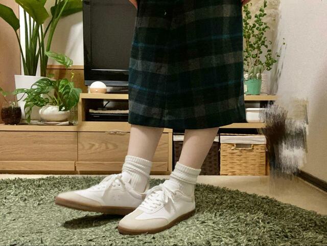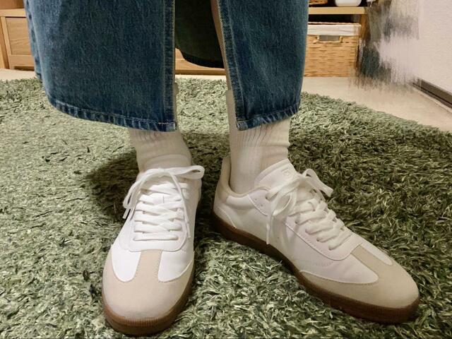 足を出す服装でも、スニーカーがスッキリしたシルエットなので相性抜群です!足元に印象を置き過ぎないデザインが合わせやすいです。