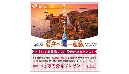 「アトレでお買物して北陸の旅をおトクに!」では、JRE POINTのウェブサイトからエントリーした上で、対象の「アトレ」店舗にて期間中に合計税込1万円以上のJRE POINTが貯まる買い物をした人の中から抽選で30名に、3万円分の北陸エリアへの旅行に使える「JR東日本びゅうダイナミックレールパック」割引クーポンが当たる。なお、同キャンペーンによる売上の一部は、令和6年能登半島地震の被災地へ義援金として寄付される。