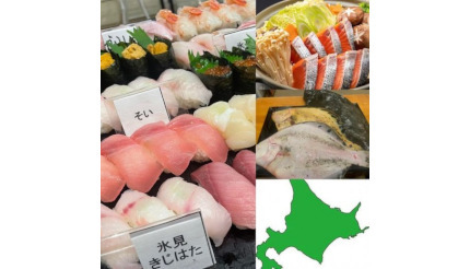 寿司食べ放題は、「いくら」「うに」「ホタテ」をはじめ、北海道産の鮮魚「そい」「かれい」「ひらめ」「ほっけ」「にしん」「ヒラメ」「さくらます」などを中心に、北海道だけでは魚種が少ないので氷見や茨城からの「ぶり」「あじ」「いか」「真鯛」といった定番ネタを加えた、総勢20種以上を用意する。さらに、プラス1000円で痛風鍋も人数分付けられる。