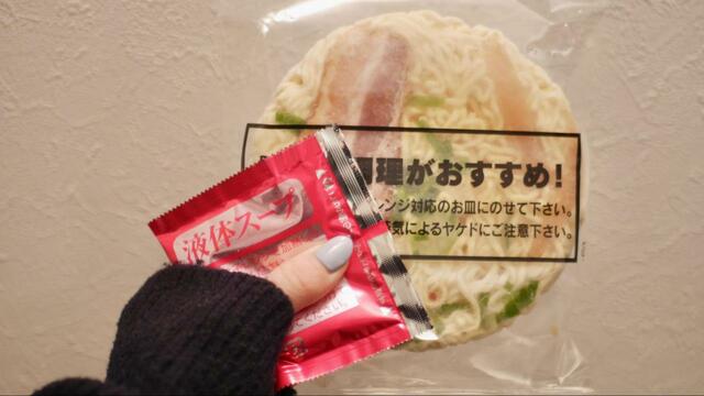 液体スープと具付き麺(麺、チャーシュー、メンマ、ねぎ)が入っています。