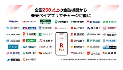 「楽天ペイ」アプリを通じて全国261の金融機関口座から「楽天キャッシュ」にチャージできるように
