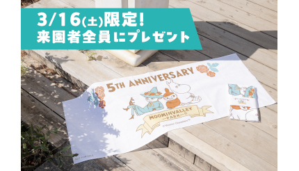 開業5周年記念日となる3月16日には先着順で「5TH ANNIVERSARY」オリジナル手ぬぐいを来園者全員にプレゼントする(なくなり次第終了)。また、23年冬から好評を得ている湖上花火を今春も開催。「ムーミン谷の小さな花火大会 春 ~5TH ANNIVERSARY Ver.~」として、3月の土日と祝日に約5分間(3月16日のみスペシャルバージョン)の花火を打ち上げる。