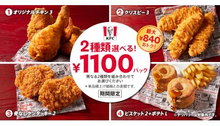 日本ケンタッキー・フライド・チキンは3月13日~4月16日の期間、全国の「ケンタッキーフライドチキン(KFC)」店舗(一部、およびデリバリーを除く)で「2種類選べる!1100円パック」を販売する。