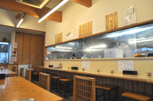一見、外観は街のどこにでもあるようなラーメン店に見えるが、店内にはいるとその広さと建物の高さに驚く。店内は木のテーブルとイスが並べられ、これらはすべて同店の手作りなのだそうだ。
