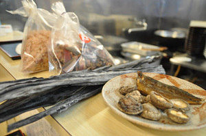 同店の食材はすべて和風にこだわっているとのこと。ラーメンのスープの素材として鶏ガラ、豚の背ガラをベースとし、サバ、カツオ(厚削りと花ガツオ)、昆布、シイタケ、6種類の野菜を使用。