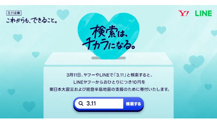LINEヤフーは、「ヤフー」や「LINE」で「3.11」と検索すると1人につき10円をLINEヤフーから東北や能登の支援団体へ寄付する取り組み「検索は、チカラになる。」を3月11日23時59分まで実施している。