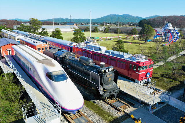 寝台特急北斗星、D51形蒸気機関車、上越新幹線などがレールパークに停まっています。
