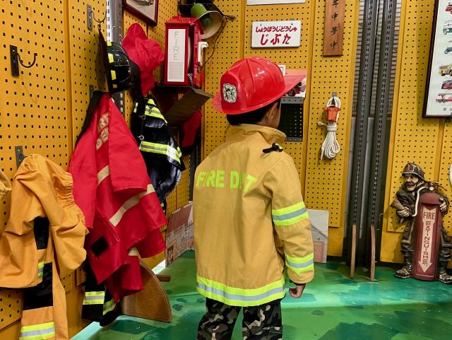 その展示コーナーには、子ども用の防火衣やヘルメットの用意が。