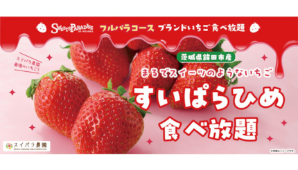 スイーツパラダイス(スイパラ)では3月13日から、「フルパラコース」を開催。国産ブランドいちご食べ放題の第3弾として「すいぱらひめ食べ放題」を実施する。なくなり次第終了。