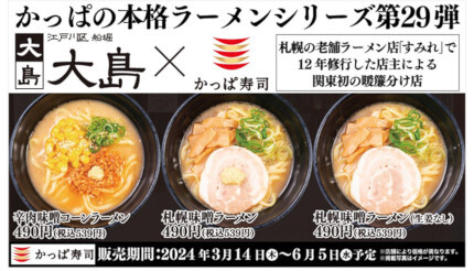 カッパ・クリエイトは3月14日~6月5日の期間、「本格ラーメンシリーズ」第29弾として「大島」(東京都江戸川区)の監修による「辛肉味噌コーンラーメン」「札幌味噌ラーメン」「札幌味噌ラーメン(生姜なし)」の3品を「かっぱ寿司」全店で販売する。