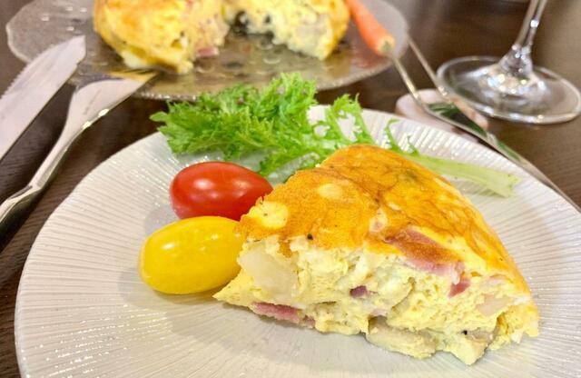 おいしそうな焼き色がついて、おいしいキッシュができました。ちょっとしたパーティーメニューの1品にもなりそうです。