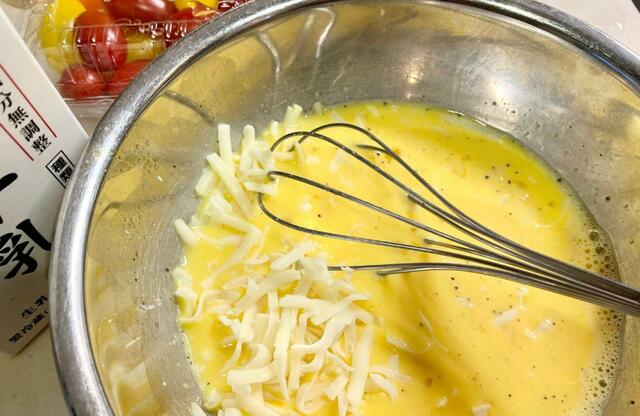 卵に牛乳やチーズを混ぜ、材料をすべて炊飯器に入れます。