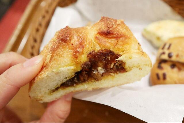 カレーをフランス生地で包んだ、ちょっと珍しいカレーパンです。中のカレーは辛さ控えめのやさしい味わいなので、辛いのが苦手な方でもおいしく食べられそうです。少量でもボリューミー。