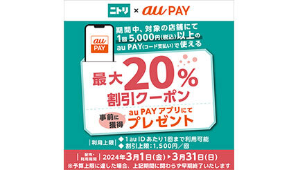 ニトリホールディングスは、全国の「ニトリ」「デコホーム」「N+」にて、新たな決済方法として2024年2月から「au PAY(コード支払い)」の取り扱いを開始したことを記念して、1回5000円以上のau PAY(コード支払い)で使える、最大20%割引クーポンを3月1日から31日まで配信する。