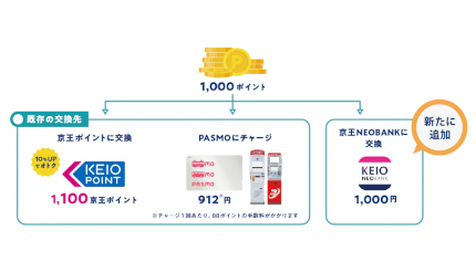 京王電鉄が提供している鉄道乗車ポイントサービスの京王トレインポイントは、これまで「京王ポイント」「PASMOチャージ」を交換先としていたが、4月1日からトレインポイントの交換先に京王NEOBANKを追加する。
