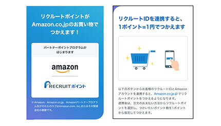 今回の、リクルートとAmazon.co.jpとの連携は、リクルートがアマゾンジャパンのパートナーポイントプログラムへ参画したことから実現したもので、リクルートIDとAmazonアカウントの連携が可能になり、Amazon.co.jpでの買い物の際にリクルートポイントが使えるようになった。