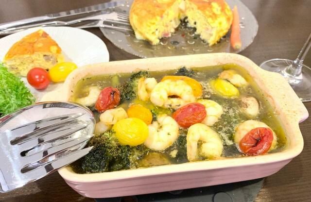 今回は冷凍のエビを解凍して使用しました。アヒージョは見た目も楽しみたいので、彩りを考えて耐熱皿に入れます。