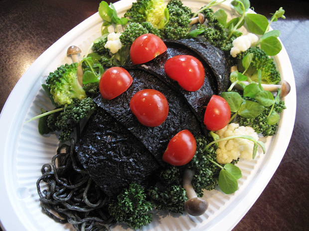 『帰ってきた!あの!オムライス!』は、いろいろな理由で名前が出せない"例のアレ"をモチーフにしたオムライス。イカスミで色を付けた卵で包んだ真っ黒いオムライスにプチトマトの赤い斑点がアクセントとなって、なかなかの再現度。森を表現するブロッコリーやパセリなど野菜がたっぷりなのも嬉しいですね。