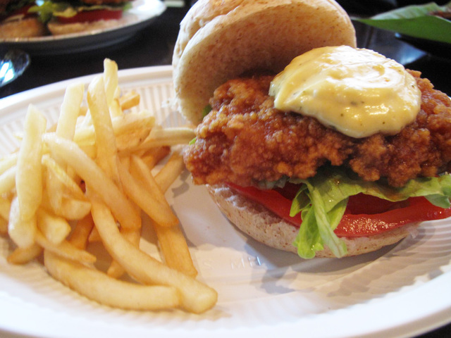 まずは『ニコバーガー』『チキン南蛮バーガー』。チキン南蛮バーガーを試食しましたが、かなりのボリューム! まずチキン南蛮がぶ厚い! そしてレタスとトマトもしっかり存在感あります。ポテトセットにしたら十分な食事になりそうです。