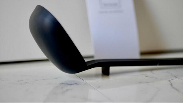 このお玉は背面に小さなスタンドがついていて、先端を浮かせて置ける構造になっています。直置きにならず使えて衛生的...!