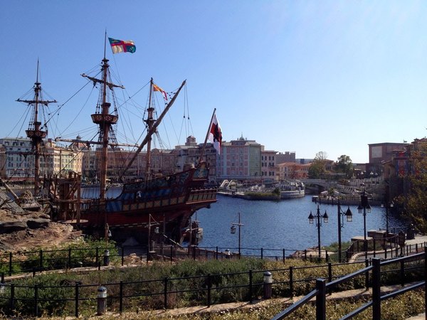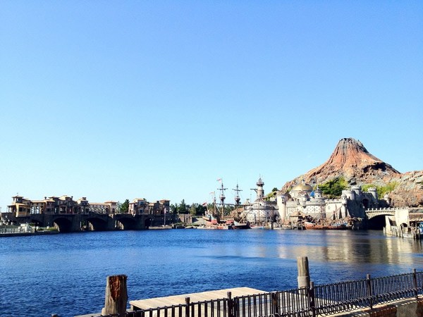 「フォートレス・エクスプロレーション」のガレオン船と、誰もいないリドアイル(右手奥の出島)。目に入るものすべてが新鮮 ©Disney
