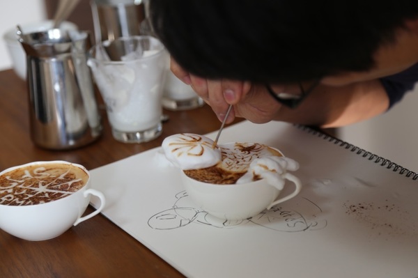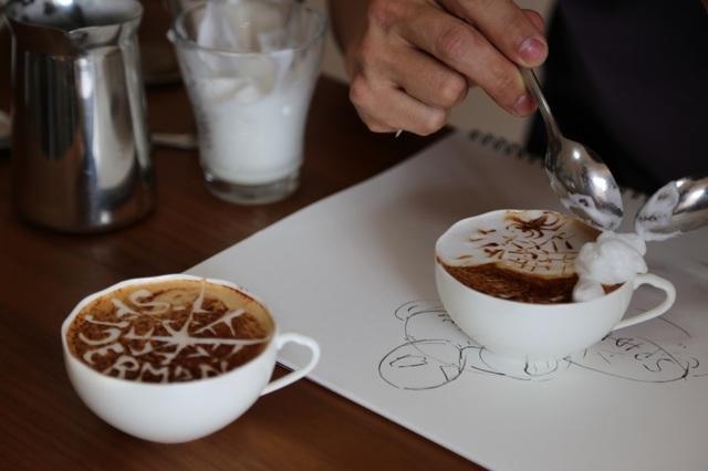 3D部分はスプーン2本を使ってスチームされたミルクがモコモコと盛られていく。