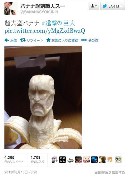 次に紹介したいのが、海外メディアでもとりあげられているバナナ彫刻家職人の山田恵輔さん26歳。「進撃の巨人」アートは4000RT超えをするほど人気で、バナナの皮にイラストを描いて剥く前後でインパクトを生むパターンも展開していたりする。