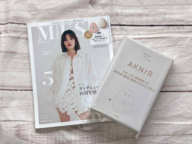 宝島社から3月28日(木)に発売された『otonaMUSE(オトナミューズ)』2024年5月号には、梨花さんコラボの「AKNIR(アクニー)EMS・LED・振動機能付き電気スカルプブラシ」が付録としてついてきます。